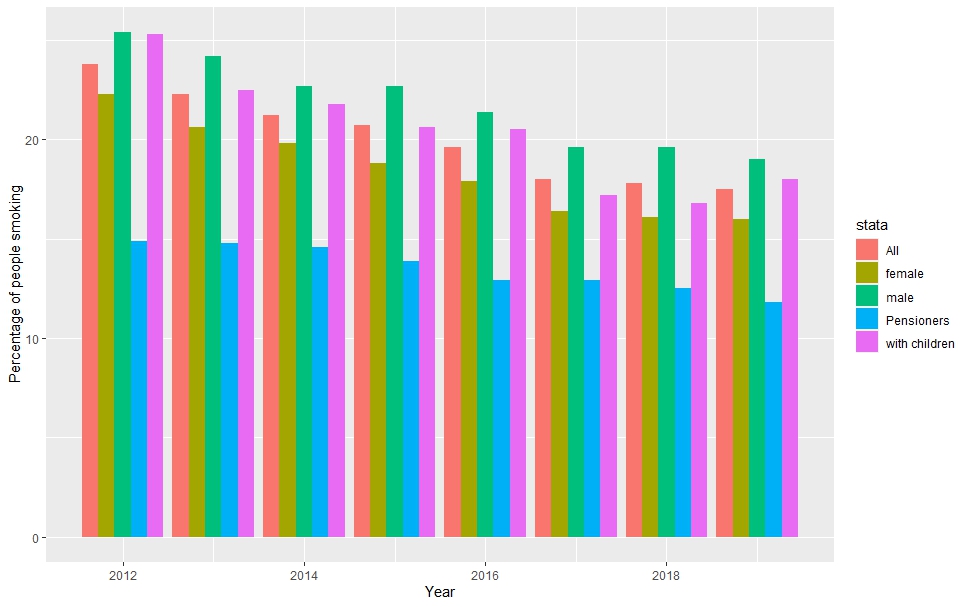Beyond age, we can compare smoking rates among different social groups—such as pensioners, parents, and by gender.