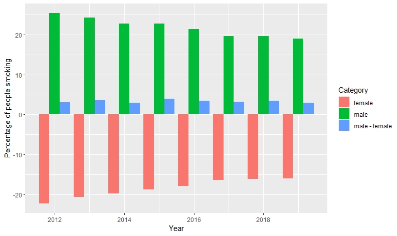Overall, there is a consistent decrease in smoking across nearly all groups, as further illustrated by the chart below: