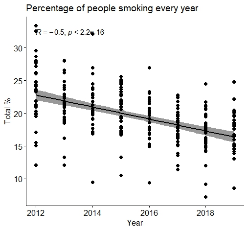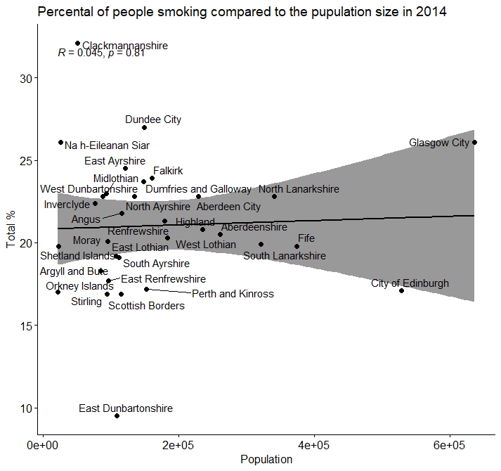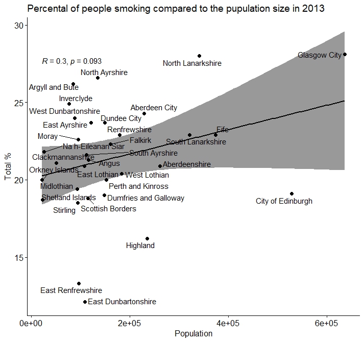 The highest correlation found was in 2014 (81%), but all other years were below 50%—meaning population size was not a reliable predictor of smoking rates. Even large city constituencies showed no consistent relationship.